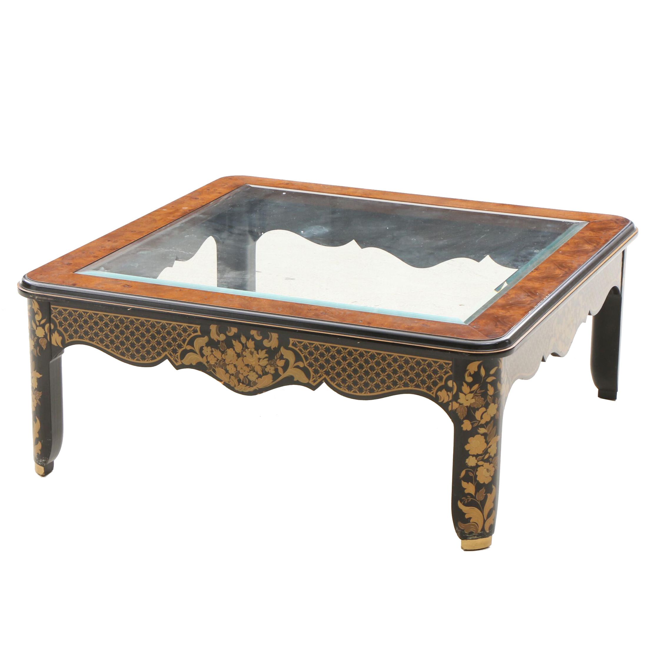 Burlwood Veneer And Glass Top Gilt Stenciled Coffee Table Ebth