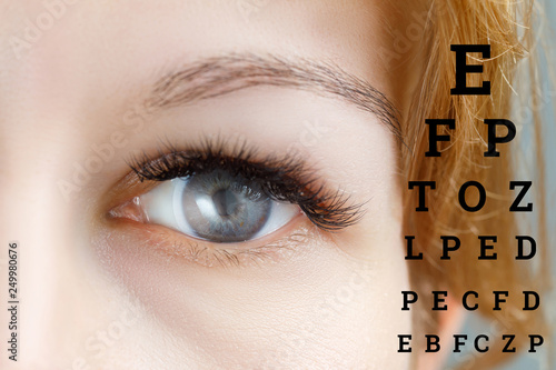Closeup Of A Female Eye In Contact Lens And A Sight Test Table